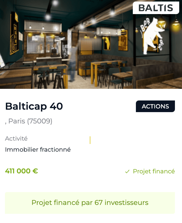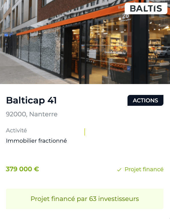 La société émet un nombre d’obligations équivalant au coût total du projet. Les investisseurs Baltis y souscrivent, chacune représentant une fraction du bien immobilier.